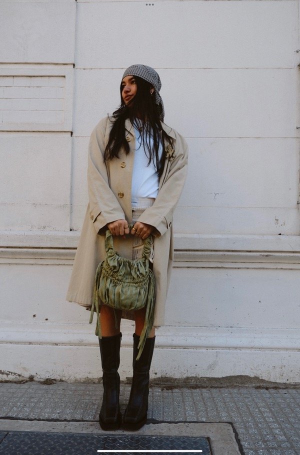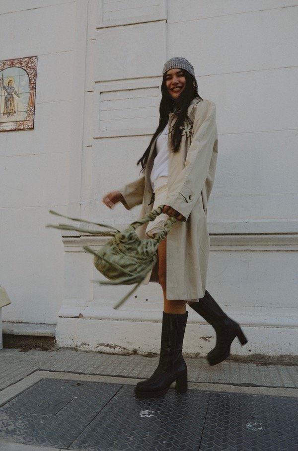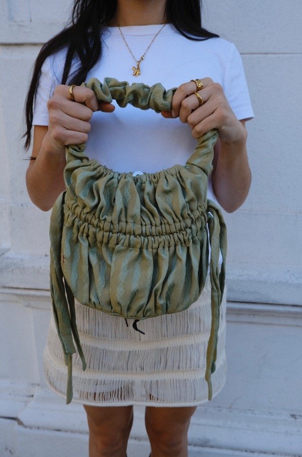 Bolso Cotton candy, con bolso interno y botón metálico imantado. Bordado de la marca en la esquina. Frunces no regulables, tiras que se pueden atar y generar un moño.